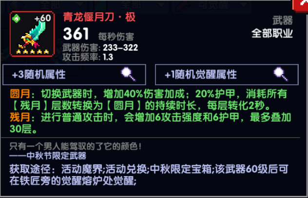 中秋武器的觉醒属性上,攻强相当的优秀,推荐选择攻强,特别是用偶像魂卡的