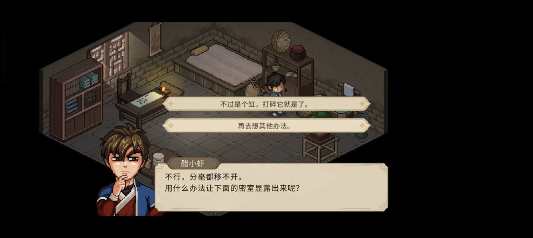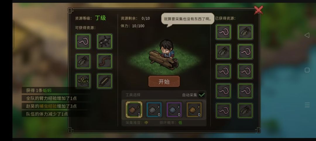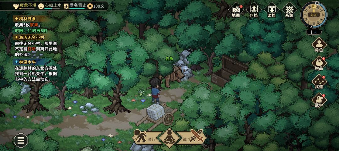 旁边木堆捡斧子,进入战斗打掉柴,进入开箱得藏宝图,在迷踪林带铲子(铁匠可购买)得第一桶金1500文