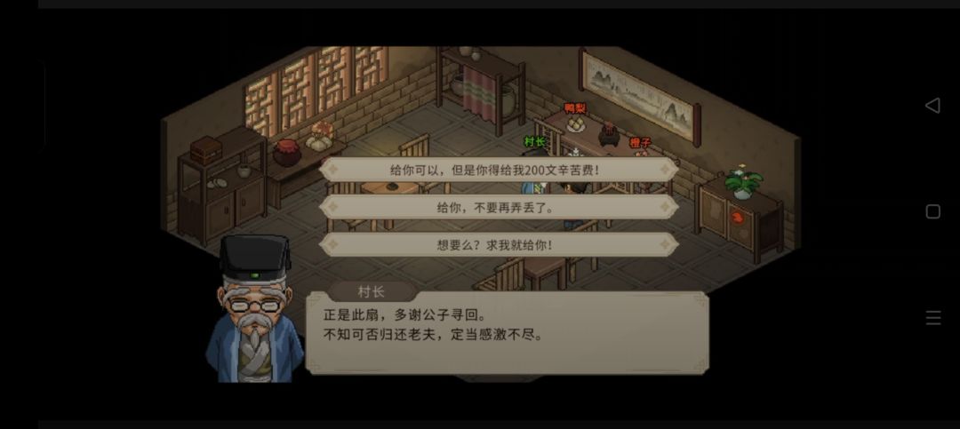 - 村长好感-2,获得200文,无名小村关系-1