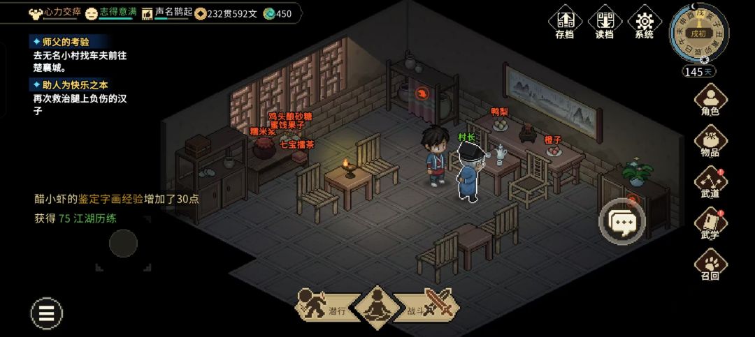 - 村长好感+5,义气+2,无名小村关系+3,名声+10