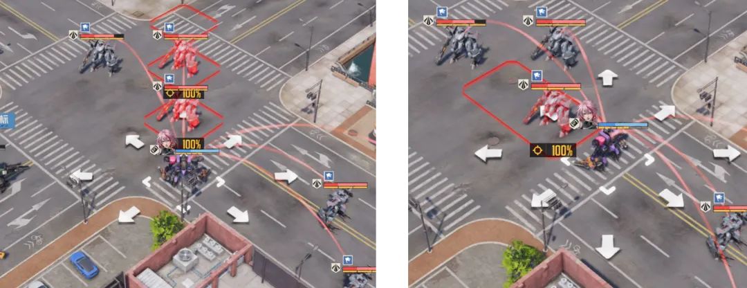 - 敌人时间必须是紧挨着才能实现群体伤害和3格以上的移动,要不然就只能像上图右侧图片中移动2格