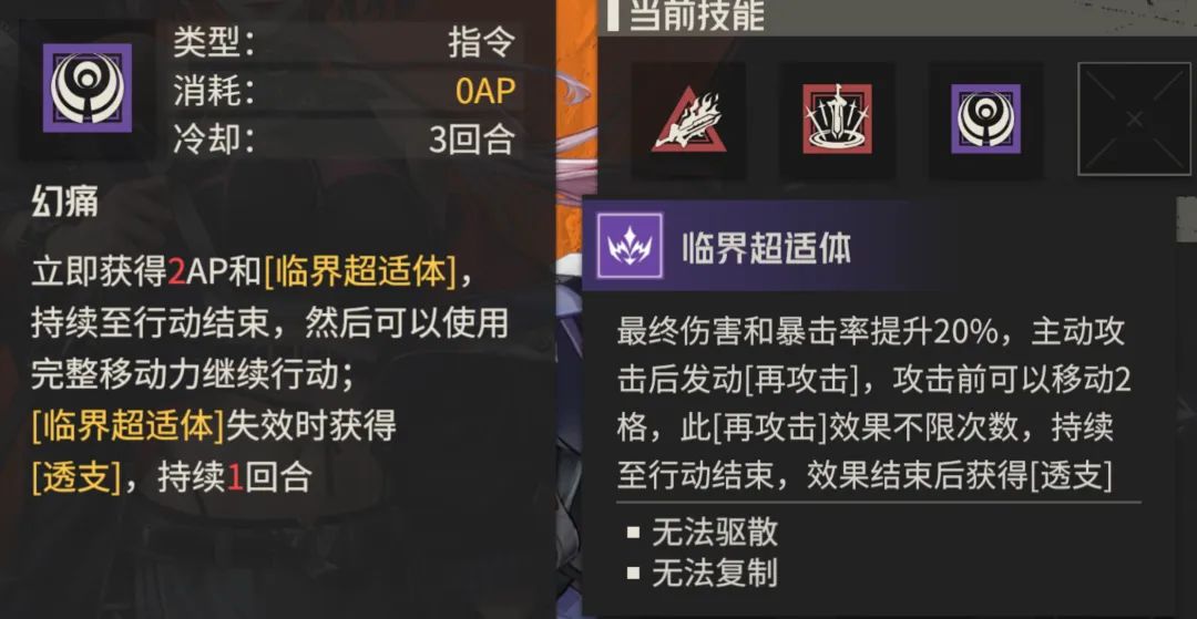 然后奥菲利亚的核心技能是【幻痛】,这个技能表面上看起来非常夸张,因为可以不断行动,直至AP耗尽,并且还有终伤和暴击率的提升(不过需要透支下回合的行动AP),但多次的实战测试之后维一感觉......这个技能没啥问题,但最大的问题是奥菲利亚在练度不高时还是有点太脆了,很有可能自己AP都还没干完自己的手都没了......