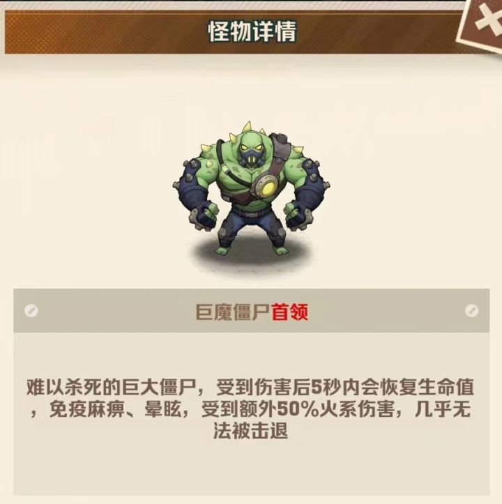 僵尸首领:难以杀死的巨大僵尸,受到伤害后5秒内会恢复生命值,免疫麻痹、晕眩,受到额外50%火系伤害,几乎无法被击退;
