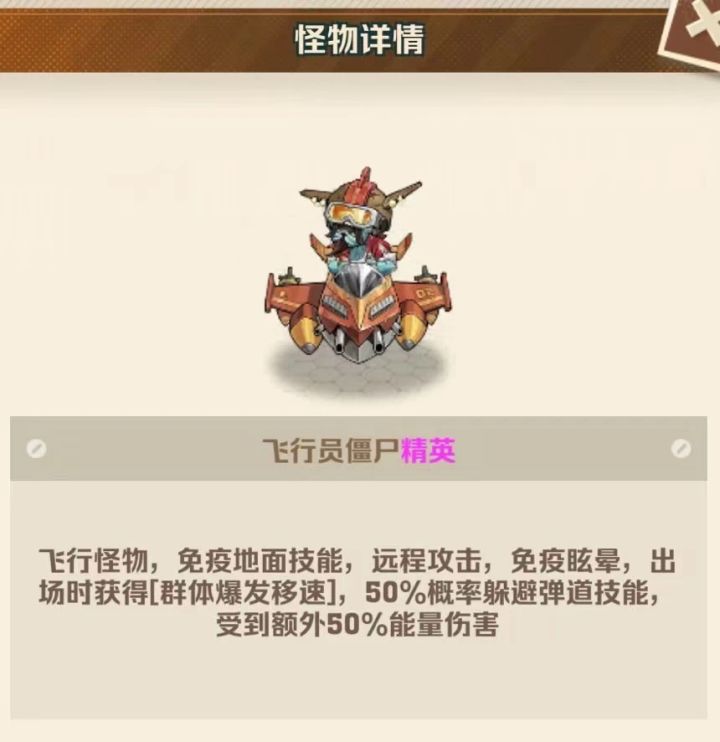 飞行员僵尸精英:飞行怪物,免疫地面技能,远程攻击,免疫眩晕,出场时获得[群体爆发移速],50%概率躲避弹道技能,受到额外50%能量伤害;