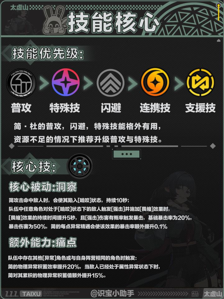 普攻>特殊技>闪避>连携技>支援技,简·杜的普攻,闪避,特殊技能格外有用,资源不足的情况下推荐升级普攻与特殊技。