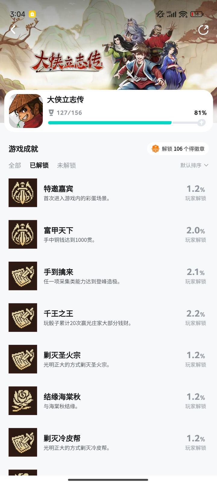 一周目解锁127个成就,万民掌刷成就教学