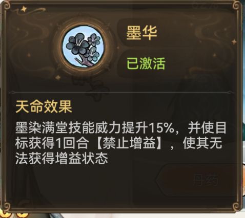 天命:墨华+分墨。下位代替墨华+行云/落墨(减速)/加全队法伤的打快攻内战