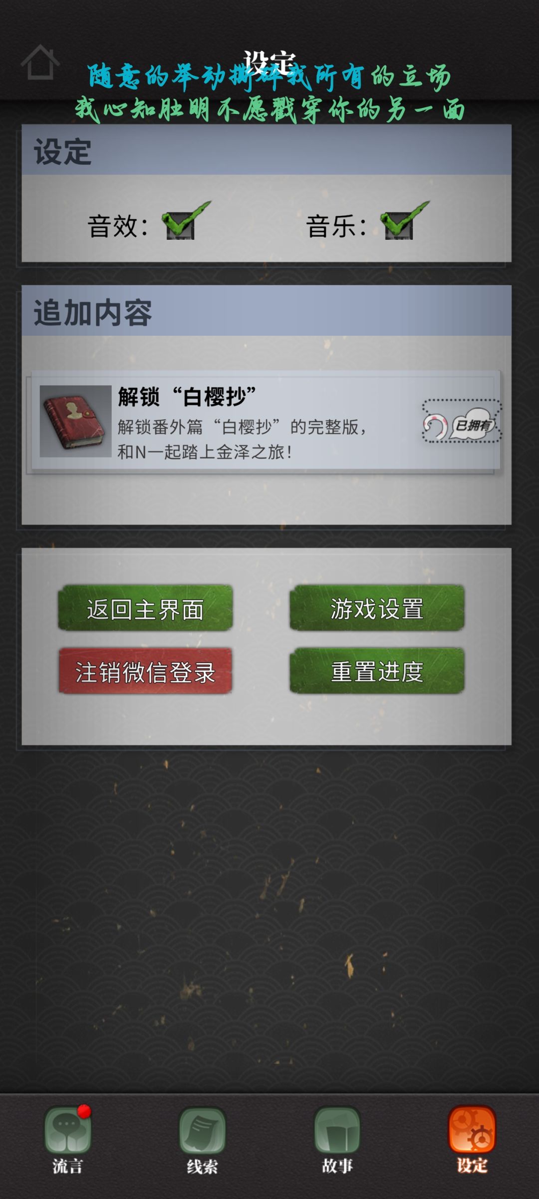 我真的很喜欢第一季的笔风,场景描写,节奏抓得非常赞喲。有些人可能嫌日常聊天啰嗦,但我个人还是很喜欢的,其实剧情蛮老套的,但是小说确实有不少优点。我还是挺喜欢里面一些对风景,打斗场面,一些对人物的描述。第一季我算是玩了三遍吧,之前的是应用商店的,早就打不开了。这回是重新下载的官服又体验了一遍,总得来说,我还是很喜欢第一季的,包括第一季所有主角,因为跟主角的日常聊天比较多,所以真的有交朋友的感觉啦。(插一句,流言好像很喜欢把最帅的那个先送走,第一季的是,第二季也是哈哈哈哈。)茜茜我是真的很好看喜欢这个姑娘,但是看了她的外传,我突然就对他的感情复杂了很多。其他角色不必说啦,诗诗就是真女神。人物非常非常饱满,这就是我对第一季的加分项。总体来说,这里的人物跟故事让我很满意。