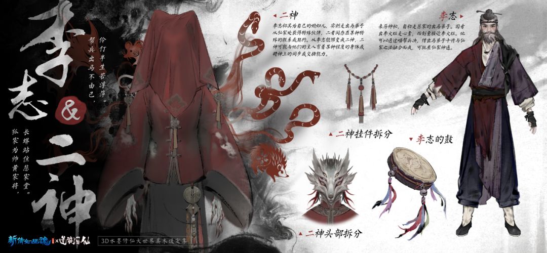 李志的二神经过整体考虑,在狐狸头的基础上多加了两对眼睛,同时也暗中迎合不同野兽结合的设定,巧妙融入刺猬的尖刺与蛇的鳞片元素,通过这些自然界的锐利与防护特性,赋予角色野性的气质。
