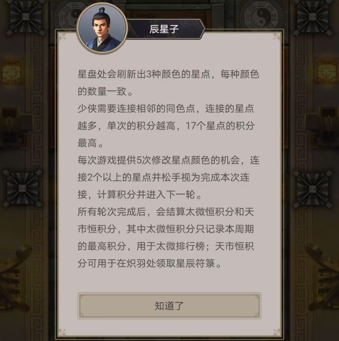积分计算:太微恒积分是排行榜计算,天市恒积分是领取奖励计算,天市恒是太微恒的两倍,也就是这个游戏每一轮连到20分以上就有200分巧舌了