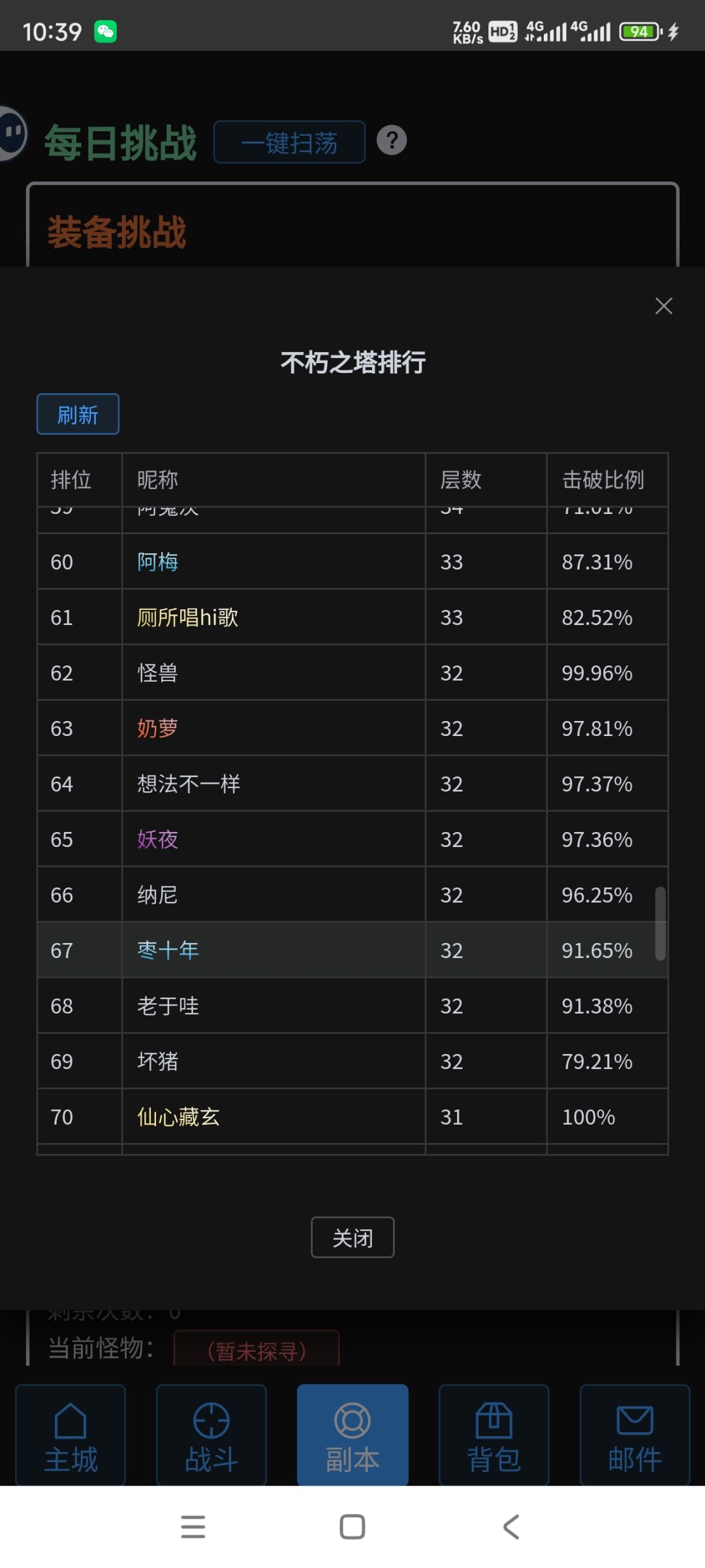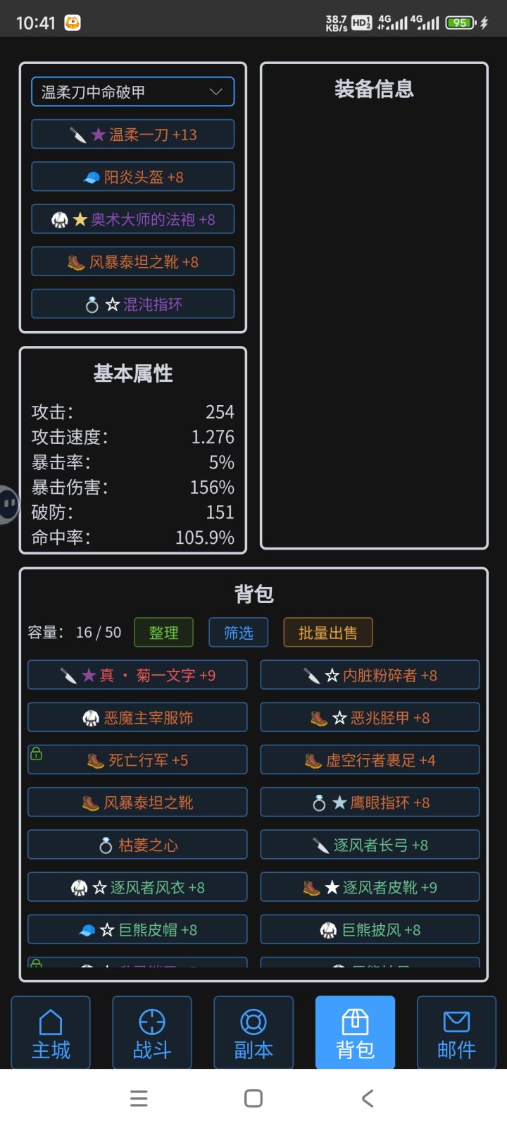 玩了算第三周,9.5的号到今天爬塔前100了,我就用三套装备过塔,温柔分裂跟暴击,个人感觉菊花刀的套装很难用,攻速太低了输出特别难受,配不上什么特效用,还是攻速带重创好一些,接下来准备培养攻速套跟暴击套,温柔一刀的下限很高上限也很低,真温柔刀+5暴击率太伤了,真刀我觉得不如普通刀,所以温柔准备转顶配星光攻速,暴击套养一个攻速重创流,目前还没人玩我自己试试,最后分裂套不变,一直养到底。