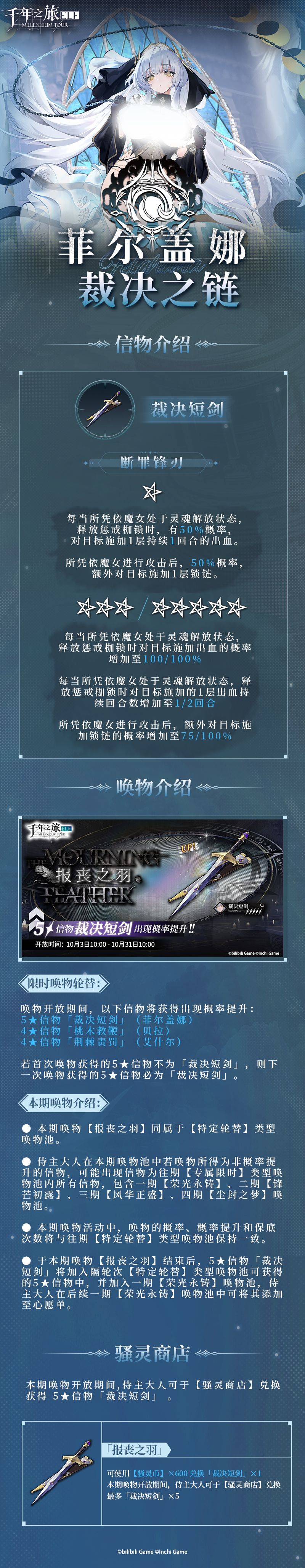 于本期唤物【报丧之羽】开放期间,侍主大人可于【骚灵商店】兑换获得5★信物 裁决短剑(菲尔盖娜)。