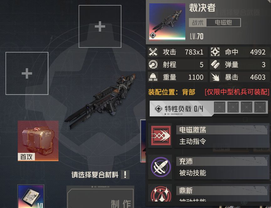 以肖妮专武为原型,叠加出力首攻背包,加以图纸等材料,即可做出复合电磁炮——裁决者,再也不用担心电磁炮占用背包位置了。