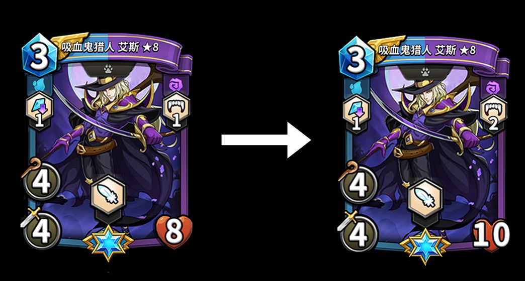 调整后:「吸血鬼猎人 艾斯」的生命值由8点提升至10点,技能<吸血1>提升至<吸血2>。