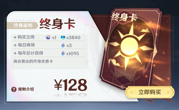 128元终身卡,购买立即获得1个超级十连道具和3840钻石,这些道具价值加一起基本就超过128了,每天还可获得3个许愿石(永久),性价比超高。