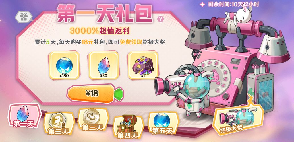 ▷第五天礼包:钻石*180、钻石*5555每天的礼包性价比都大于等于3000%,很适合小氪及以上的玩家购买。最终的核心【摇人急救兔】对于后续的主线推关也很有帮助。