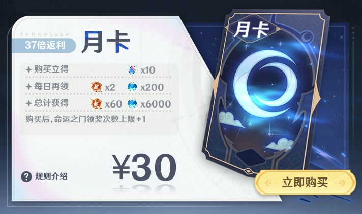 30元月卡,购买即得10个许愿石,每天2个兔王币和200钻石,兔王币可在兔王商店兑换一些稀有道具。除此之外,还有一些特权,不少主题活动可以额外领取奖励,强力推荐!