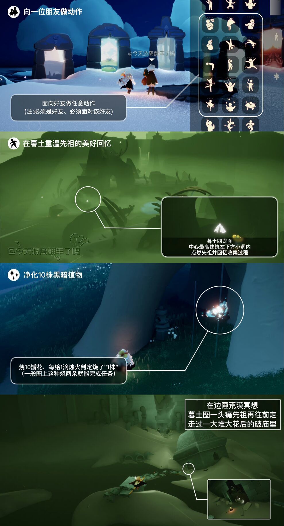 《光遇》游戏中每天的每日任务及大蜡烛的位置都不相同,玩家完成每日任务及收集大蜡烛都可以得到丰厚的兑换奖励,奖励可以用于兑换各种动作及道具,不过很多小伙伴不知道每日任务怎么做,又懒得自己去找大蜡烛的位置,我们汇总了每日任务的完成攻略以及蜡烛位置,一起来看看吧!