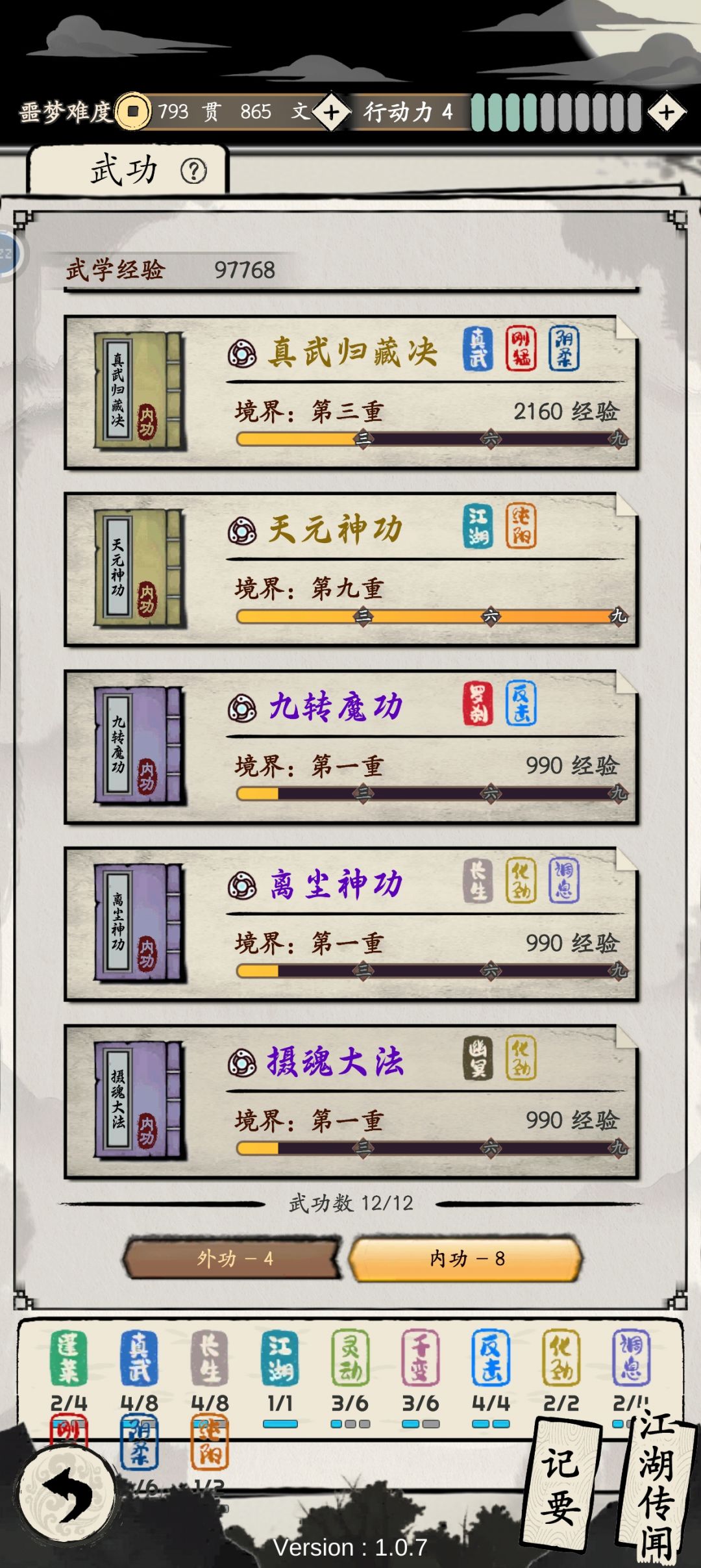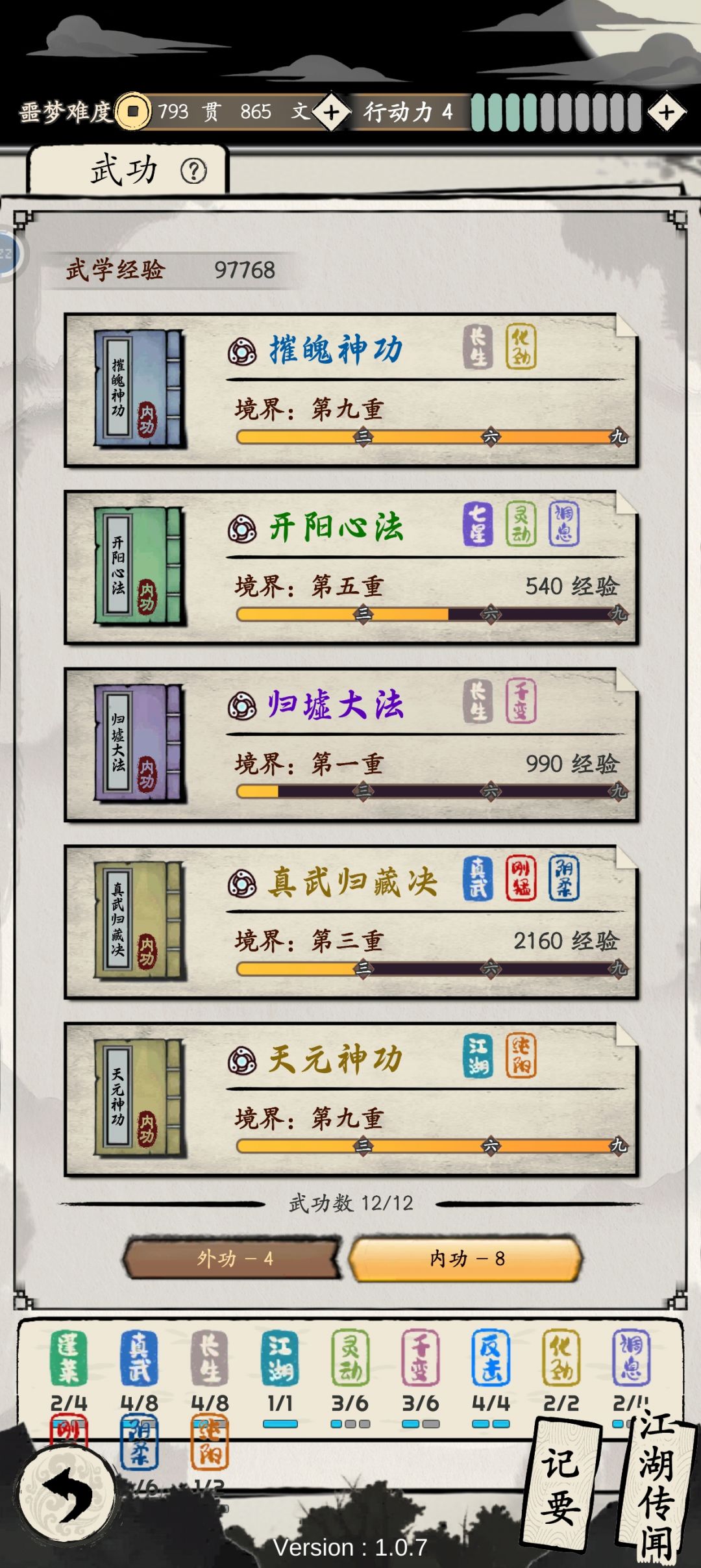 四长生提供回复,真武归藏决加天元加调息提供回气。反击加三化气,挨打的时候还能反击还能回气,天元搭配坚守提供超高防御。三灵动配合开阳心法跑的还快。四真武保证平A也有伤害,三千变三阴柔配合反击和灵动频繁触发提高伤害。