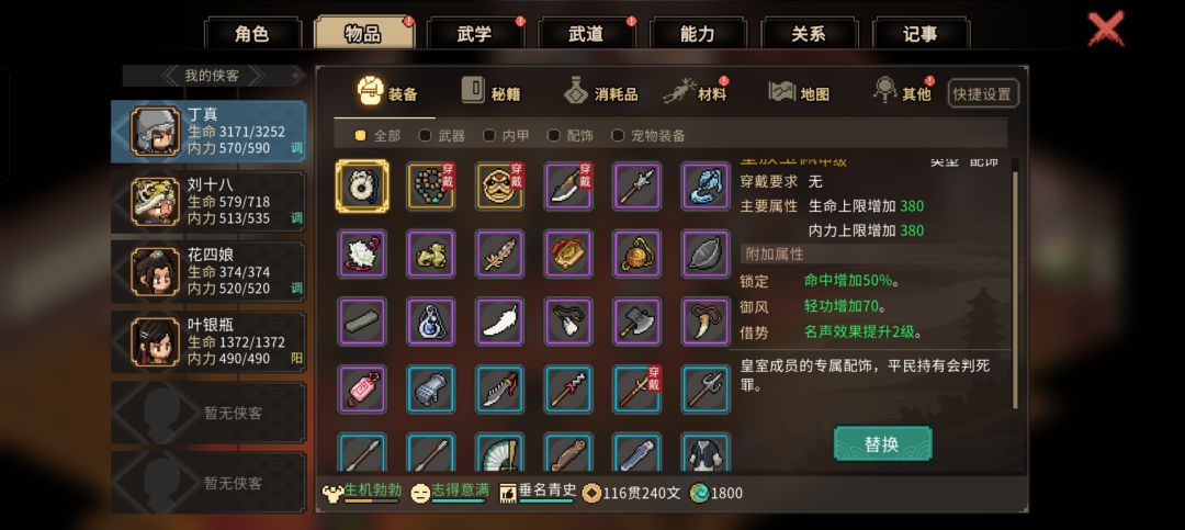 皇室驸马(名声等级低于6级时默认按照6级生效;和非敌方角色首次见面时关系值额外增加20;每经过1天获得2贯铜钱;给女性送礼效果减少90%)