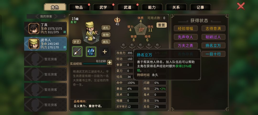 说书人特性:扬名立万(入队后帮助主角额外获得15%名声经验)