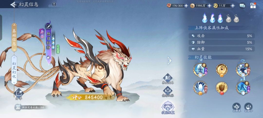 战斗开始时,魔·蝶妖为后排所有魔·蜻蜓妖附加【怒风]每回合开始时立即回复1000点怒气,速度及减伤大幅提升,怒攻时对目标造成血量上限60%的真实伤害,持续1回合,行动前怒气不足1000点则跳过回合,若成功释放怒攻则【怒风]持续回合延长至战斗结束,宠物技能窃天奉余的降怒效果在本关卡内触发概率提升至100%