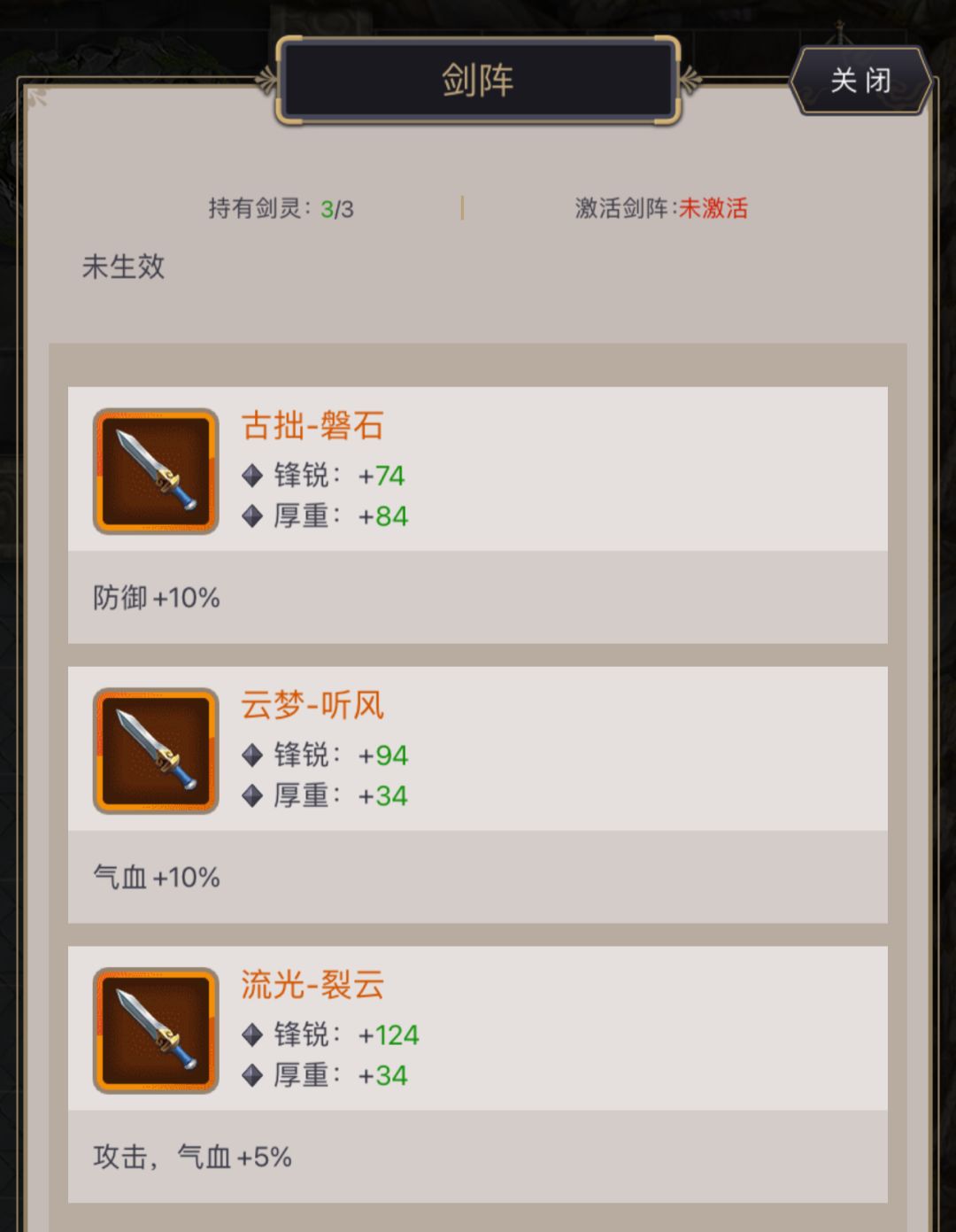 剑灵有三种前缀,如果能凑齐三种同样前缀的剑灵,可以触发特定的剑阵,剑阵能给予非常的大属性加成。对枪来说的话我觉得流光是比较优质的,能提供40%攻击和重创。拿了这个剑阵是很有机会打出巨额的爆发秒掉李阙的,同时高额的重创也能大大提升藏气的概率(枪的群攻比较多,在重创高的情况下,后排两个小弟就等于是我们刷藏气的工具)所以这个流光是很适配枪的。