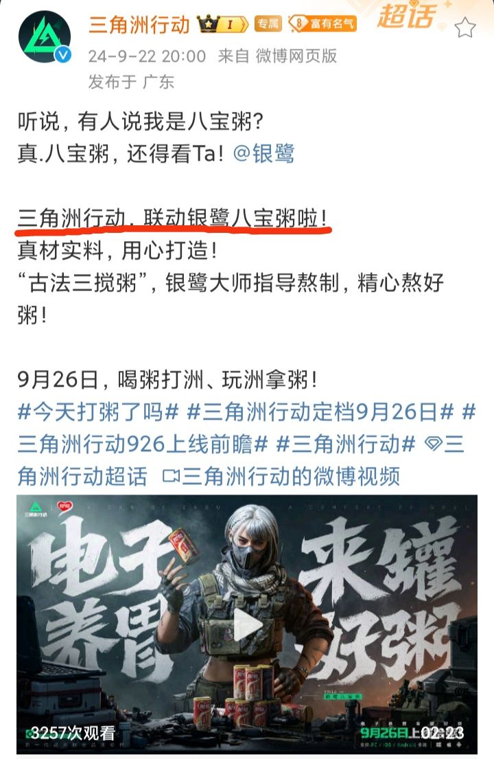 9/22号晚,《三角洲行动》官方发文宣布,确认联动银鹭八宝粥❗❗❗