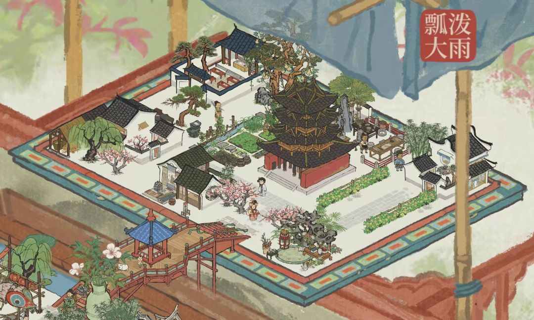 笑语台:花前自笑童心在,将此地设计为府衙所在地,布置绿茵花草点题。