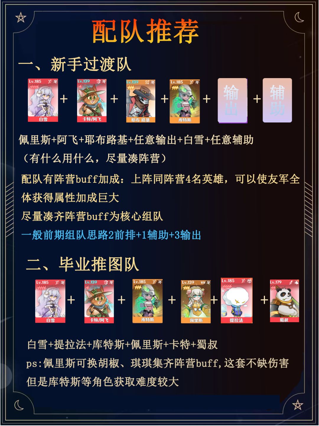 白雪+提拉法+库特斯+佩里斯+卡特+蜀叔(佩里斯可换胡椒、琪琪集齐阵营buff)