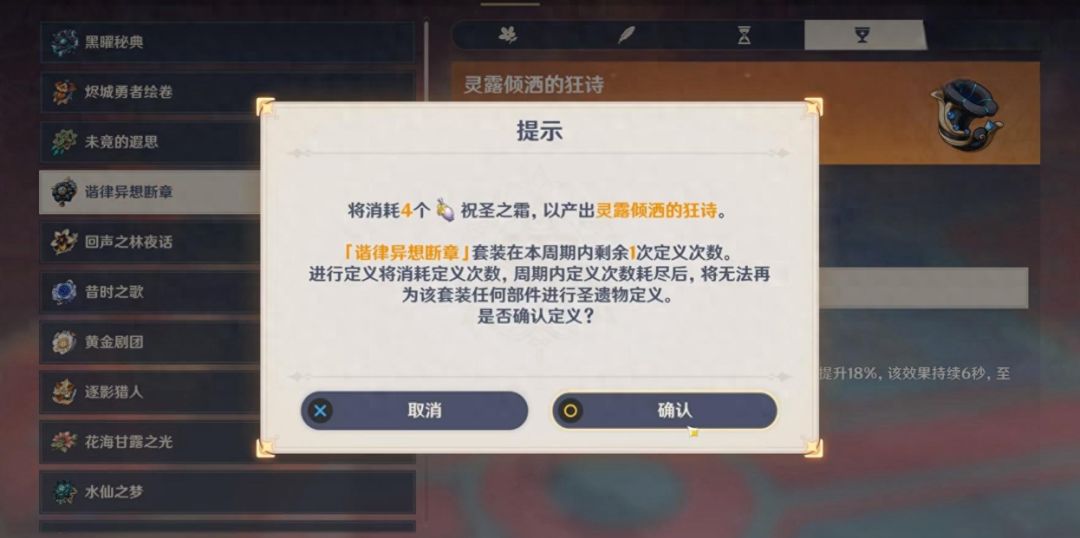 高昂的获取门槛:自定义圣遗物所需的“祝圣之霜”材料获取难度大,且各部位所需数量不等,增加了集齐一套完整圣遗物的难度。相较于传统的刷本方式,这种积累方式显得更为耗时与低效,使得玩家在资源分配上需要做出艰难抉择。过长的冷却时间:每定制一件圣遗物后长达40天的冷却期,极大地限制了玩家的自定义频率。对于追求快速提升角色战力的玩家而言,这种设计无疑是一种束缚,使得他们更倾向于选择传统的刷本方式。有限的自定义范围:即便能够定制圣遗物,玩家也只能选择两个副词条进行设定,其余词条仍随机生成,存在较大的不确定性。这种“半定制”的模式并未彻底解决玩家对圣遗物属性的需求痛点,反而可能因随机歪出的不理想词条而让玩家感到失望。