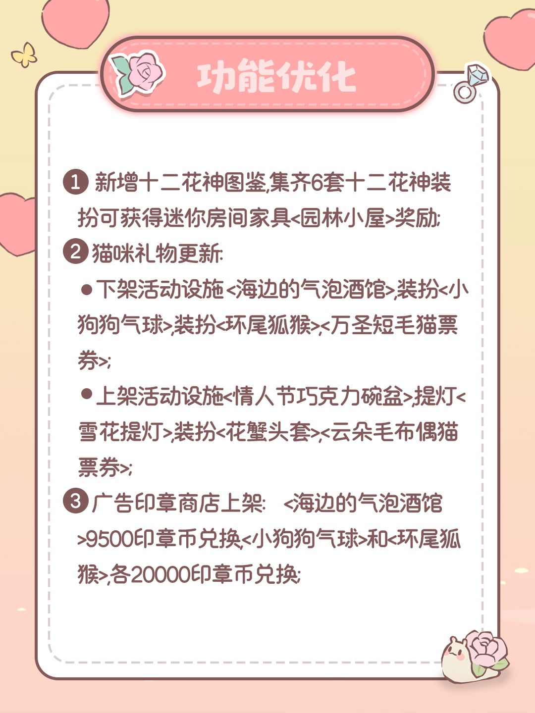 1)下架活动设施<海边的气泡酒馆>、装扮<小狗狗气球>、装扮<环尾狐猴>、<万圣短毛猫票券>;