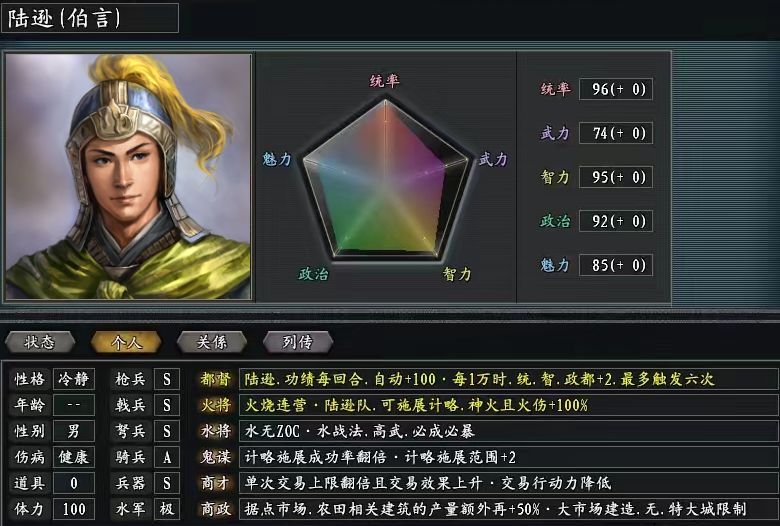 虽然很多人有点难以置信,不过陆逊在三国志11惊鸿版的东吴四大都督里,确实是综合价值的吊车尾。肉眼上看,都督、火将、水将、鬼谋、商才和商政这六个技能都还不错,实际能够在战场上作用的只有三个。都督技能只是个提升能力增长的buff,做小买卖也额外挣不了多少,一旦陆逊离开了长江沿线地区北上,除了喷火是啥都不行。