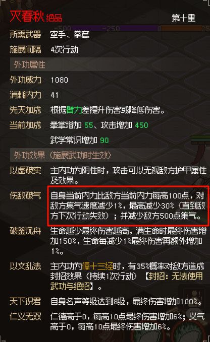 可以看到,我在使用过这个外功后,敌方集气值直接被我打成负的了,下一个回合我的集气值比对面高,所以我还是能先手。