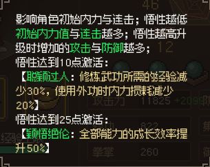 每增加1点悟性降低35内力(固定值)、降低0.02%连击/每级(例:当悟性为1时升级提升幅度为0.2%连击/每级,当悟性为10时升级提升幅度为0.02%连击/每级,当悟性≥11时提升幅度为0)