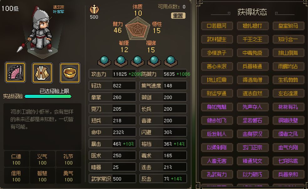其他属性:命中、闪避、暴击、格挡、闪避、医术、毒术、暗器、连击、武学常识、反击