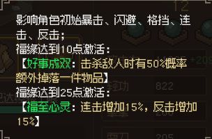 每增加1点福缘提升0.4%暴击率、0.4%闪避、0.4%格挡、0.4%连击(固定值)