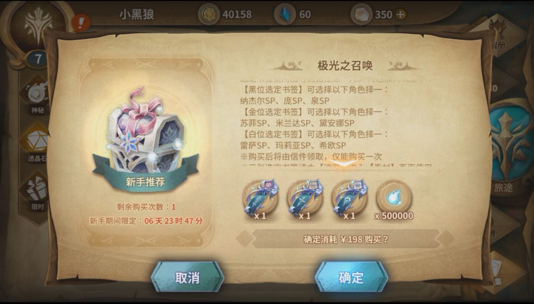 ¥198极光之召唤:3张角色三选一,单张价值¥66——还行