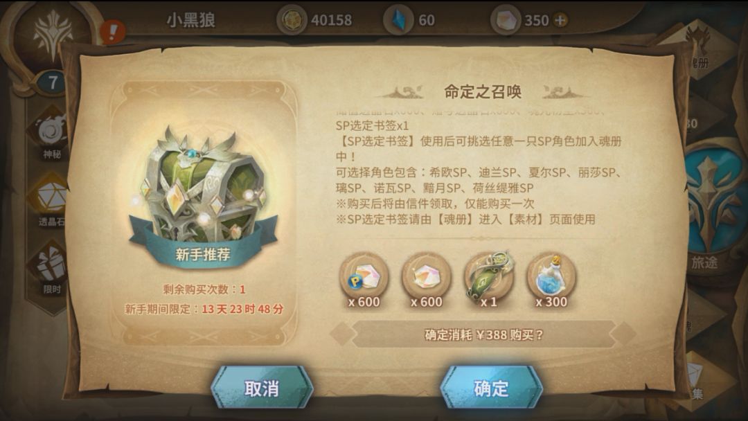 ¥388命定之召唤:透晶石价值¥120+粉价值¥85.7=205.7;1张自选角色价值¥182.3——垃圾