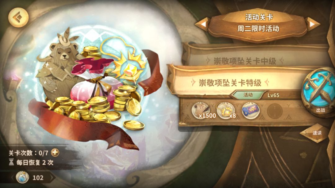 2.素材活动关卡。每天两次免费机会,刷你需要的素材,也会获得大量谛视者经验。