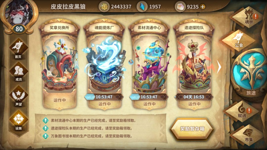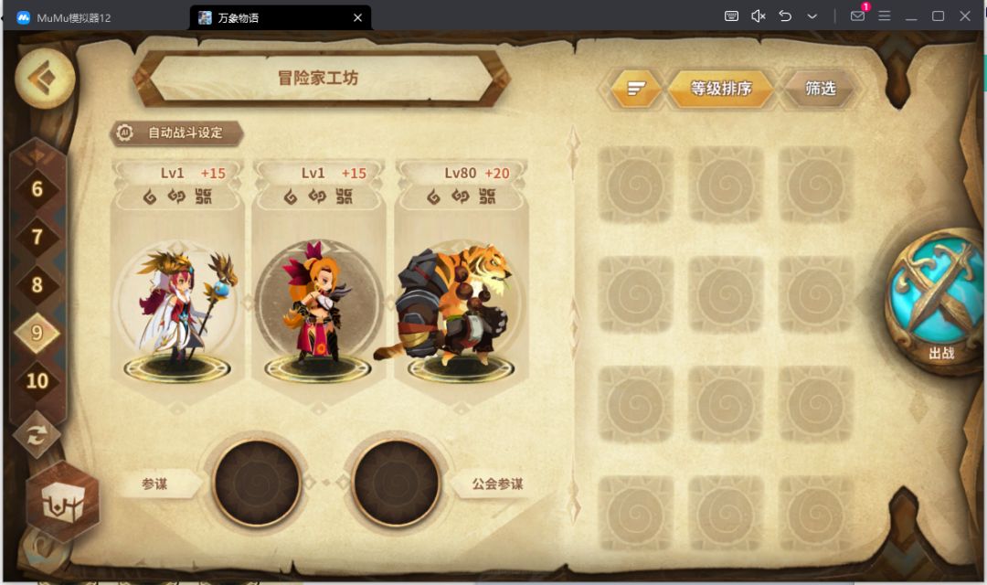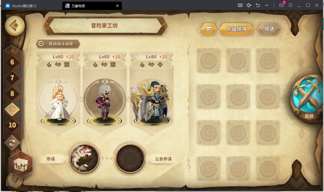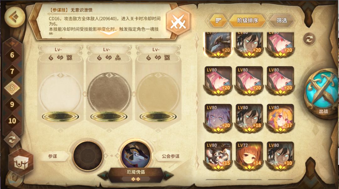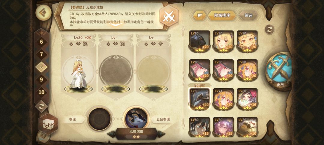 等级到了之后会解锁工会系统,找个活人多的工会。工会参谋帮助自己更容易打挑战和活动关卡。很多挑战和活动、工坊可以借一个公会大佬的甲申SP逃课,参谋16CD直接创对面20w的Aoe伤害,自己只需要拼命奶人叠盾芶住就行。