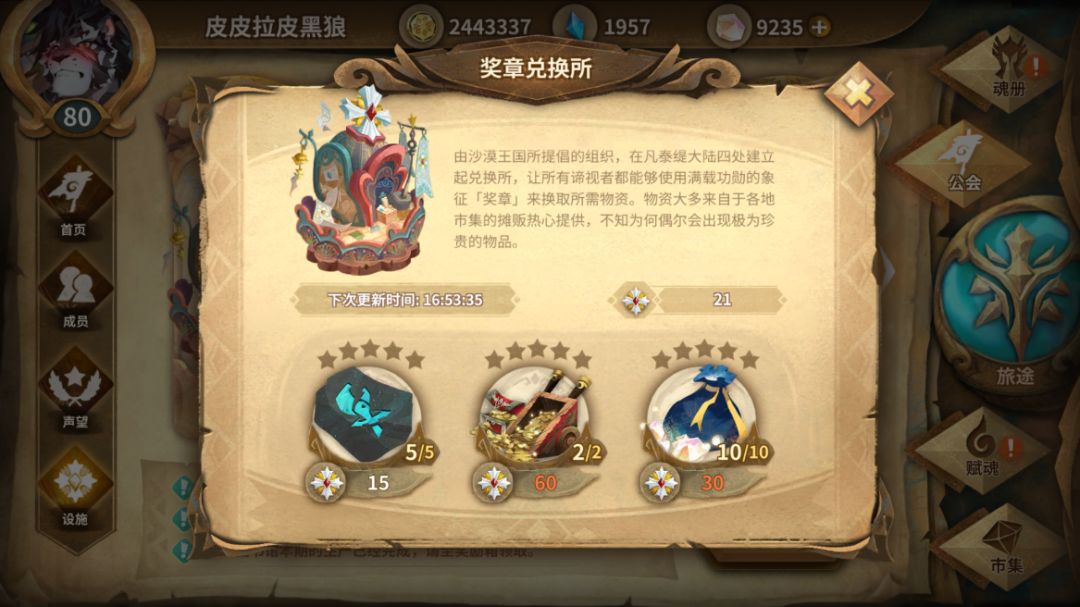 同时,公会每周奖励还会给一些养成材料、透晶石等,做工会任务获得徽章,可以兑换很多东西,主要是能换透晶石。