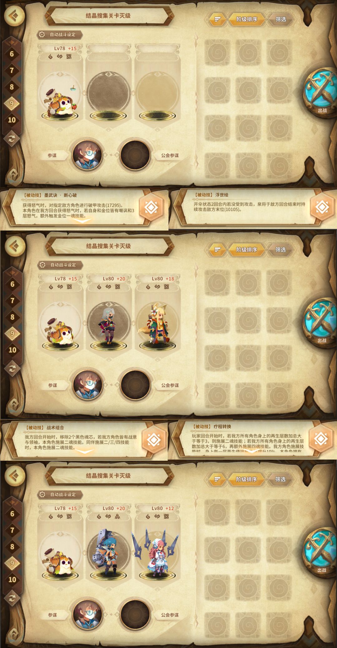 不谈关卡谈配队就是无鸡之谈,玩久了就大概知道怎么组合了,不懂怎么操作请仔细阅读角色被动和技能