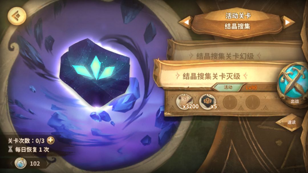 1.结晶搜集关卡。尽量打你能打过的关卡,每天免费一次机会,打过一次之后就可以用速读卷跳过关卡获得奖励。能获取大量谛视者经验+出战队伍角色对应位置魂晶碎片,可以用于角色升加值,这也是你魂晶碎片的主要来源。(黑色队伍魂晶→获得当前出战黑位角色魂晶;白色队伍魂晶→获得当前出战白位角色魂晶;金色队伍魂晶→获得当前出战金位角色魂晶;绿色队伍魂晶→获得当前出战参谋位角色魂晶)