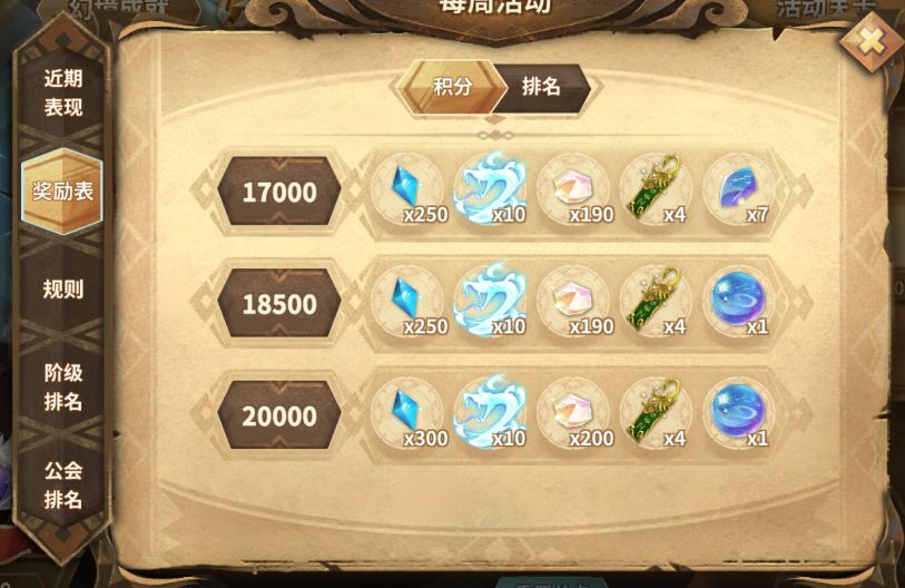 最重要的是奖励,一般我们说的低保,指的是2w分,萌新前期尽量打到2w分就行,排名分段奖励随缘。WEEK1~WEEK4轮换,周期一个月,一周一次结算,每周三领取奖励。