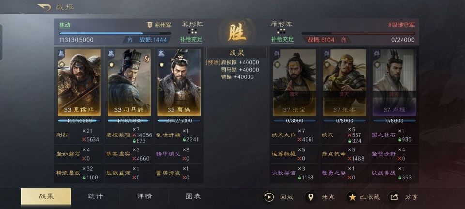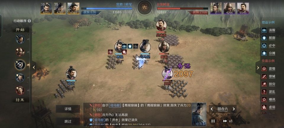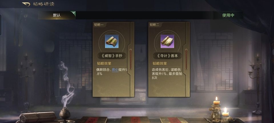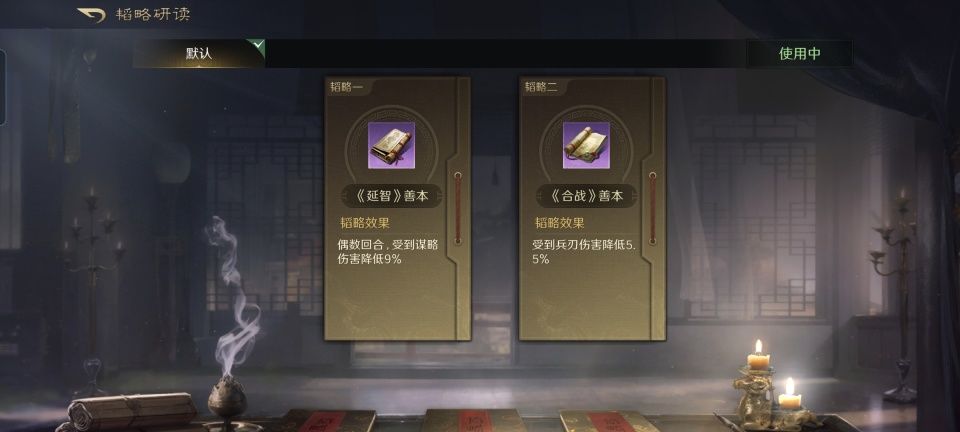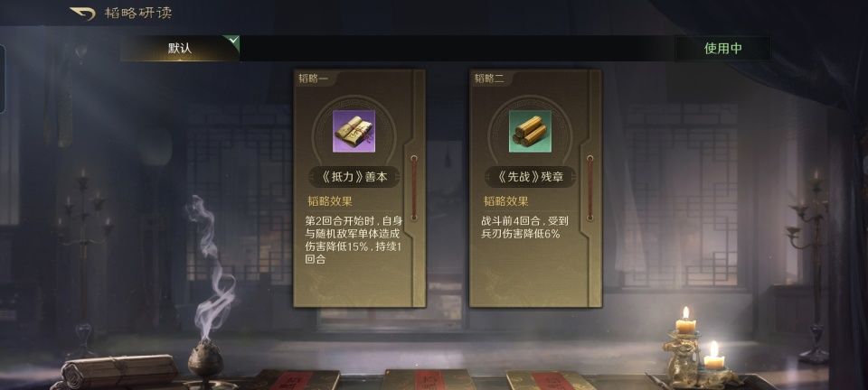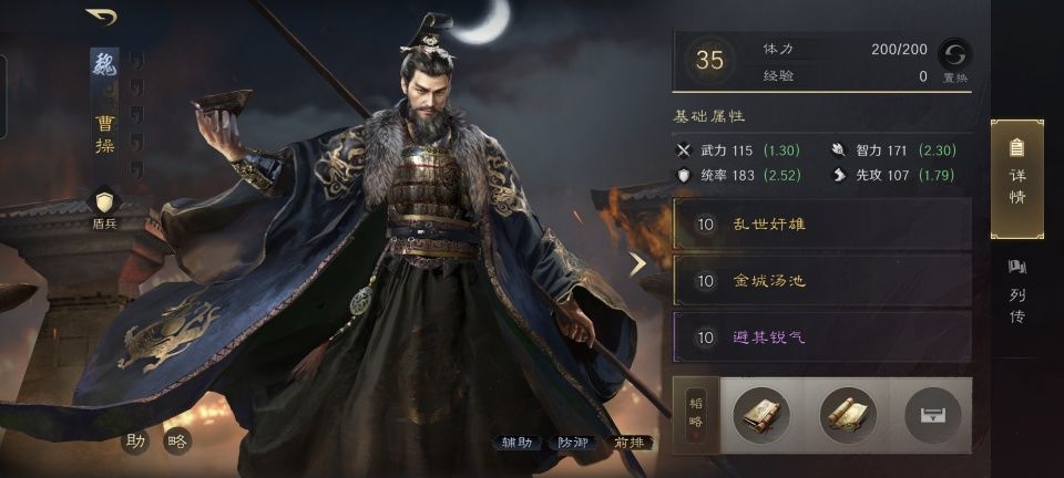 曹操战法:乱世奸雄+金城汤池+避其锐气。韬略库:延智善本+合战善本。他们两人在战斗中都是不约而同的摆出箕形阵,其中常胜丨将军让曹操站到了前排,凭借着金城汤池和避其锐气,再结合阵型站位和兵书加持,曹操至少能够硬得让野地守军打不动。