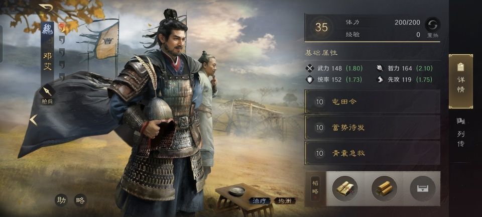 邓艾战法:屯田令+蓄势待发+青囊急救。韬略库:抵力善本+先战残章。具体到这支队伍里,曹操并不提供输出,所以蓄势待发加的就是司马懿。关键是依靠倾囊急救,及时驱散司马懿身上的负面状态,就能保证他的稳定发挥。