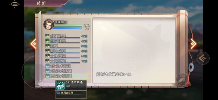 2、开局时主角和张宁尽量放技能吧,每一阶技能满10级能加法术暴击率。主角后面能学五系技能。