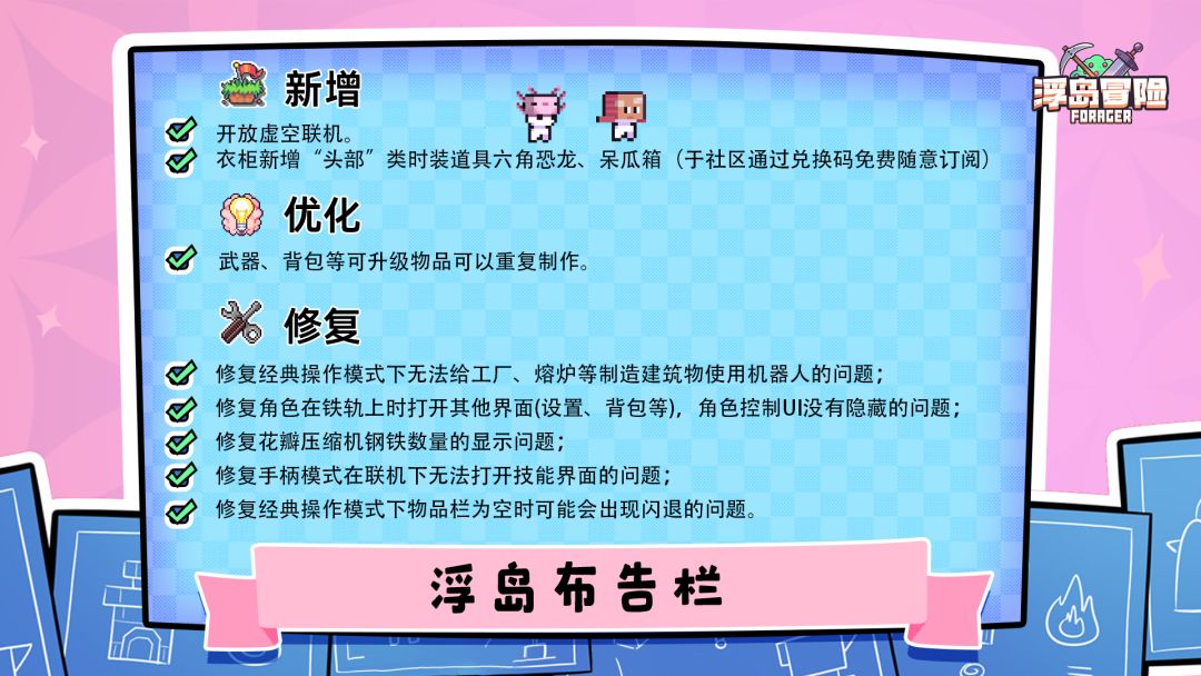 此次更新涉及到联机模式内容的新增,因此需要诸位岛主在更新推送后,更新到最新版本才能够正常进入联机模式,体验最新内容,具体的内容我们分享在下面的PATCH NOTE当中