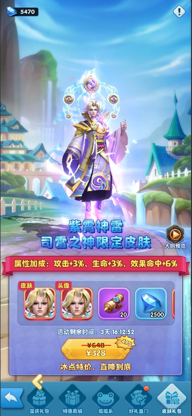 活动期间,出售司雷之神超值限定皮肤“紫霄神雷”。